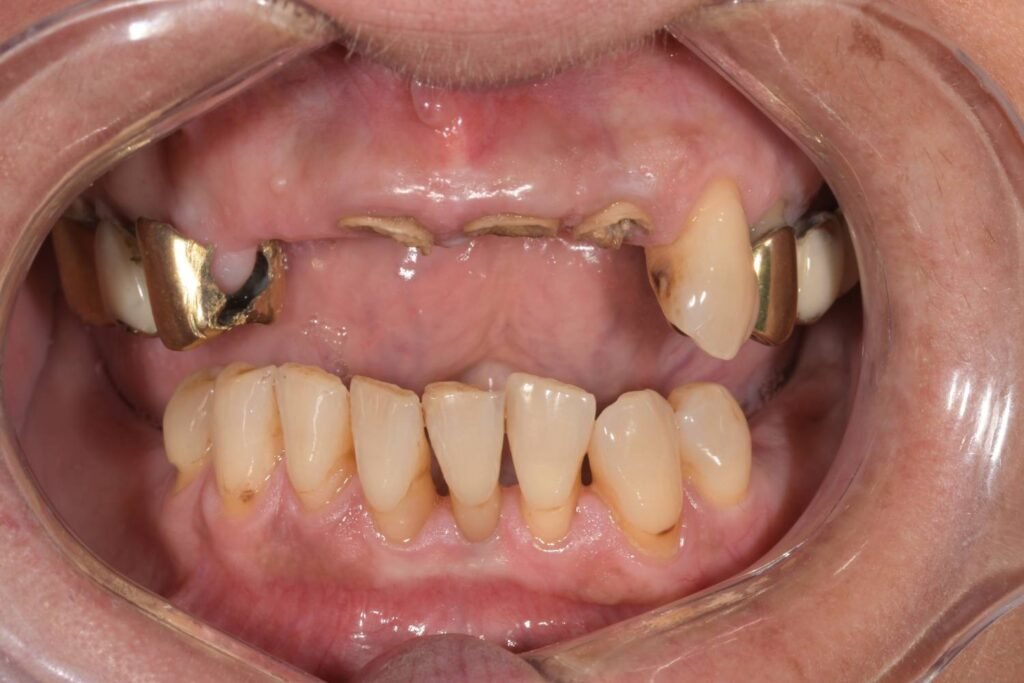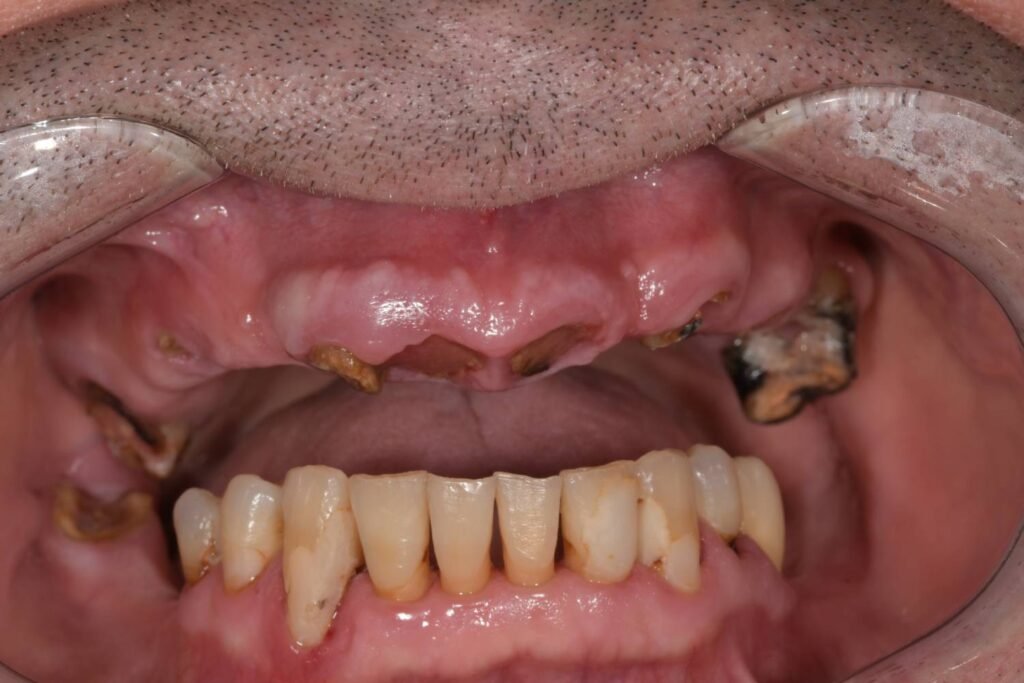 Pacientul prezenta o stare avansată de deteriorare a dinților rămași pe arcada superioară. Dinții erau sever afectați de carii extinse și distrucții coronare, fiind irecuperabili și cauzând probleme funcționale majore, disconfort, dar și o estetică puternic compromisă. Pierderea majorității dinților afecta capacitatea pacientului de a se alimenta corespunzător și de a interacționa social fără rețineri.
